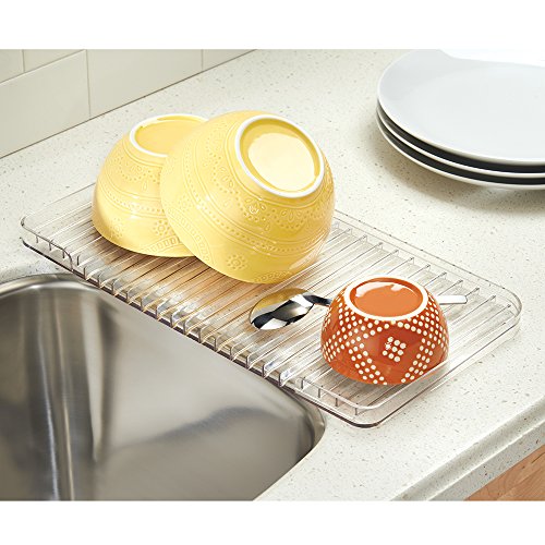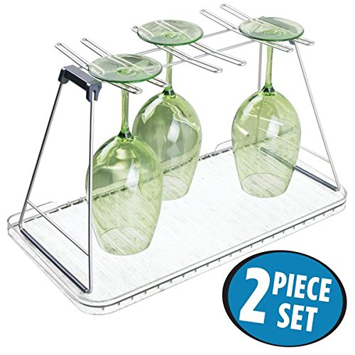 mDesign Free Standing Wine Glass Drying Rack and Dish Drain Board for Kitchen Countertops - Set of 2, Satin/Clear