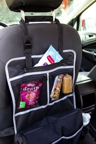 5. It also easily secures to the back of the front seat of your car which doubles as a kick mat and a car organizer!