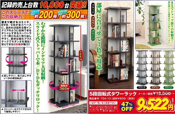 48%OFF メーカー希望価格19440円の処10284円でご提供!360度回転式で探しやすい、取り出しやすい!コミックなら約200冊、CD/DVDならなんと約300枚大容量収納!スライド式ストッパーで、本、コミック、CD、DVDをガッチリロック!このスペースでこの収納力! わずかな隙間にインテリア大量収納!! 溜まり続けるコミック・DVD・CDが、省スペースに詰めれば詰める程インテリアのように収納できる、オシャレすぎるスーパーラック! 間口も広く取り出しやすく素材は強化プラスチックでモダンさ演出! 安心できる日本製が魅力!! 高さ124cmで、コミックなら約200冊・DVDとCDなら約300枚もの大収納力! 360度回転式で取り出しもラクラク!!