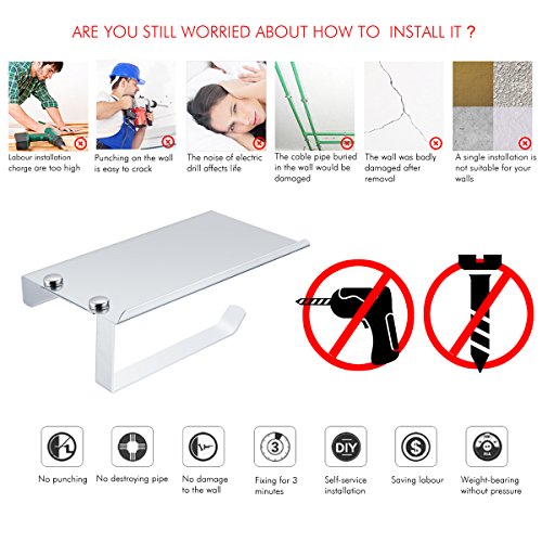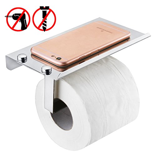 No-Drilling Toilet Paper Holder, Wall Mounted 304 Stainless Steel Roll Tissue Holder With Phone Shelf for Bathroom Restroom