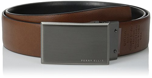 Black reversible belt with a black plaque buckle with brand printed on corner.