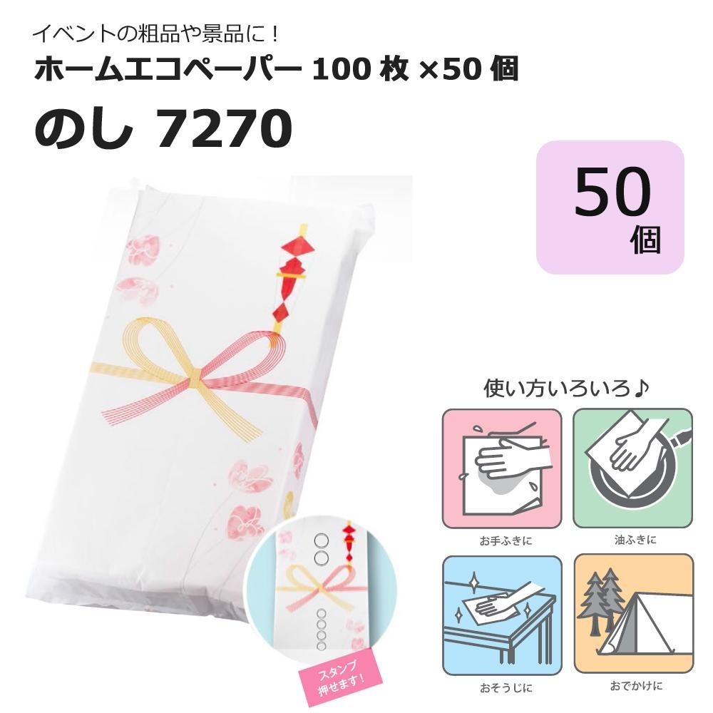 おてふきや掃除、お出かけなどに使い方いろいろです♪ 製造国:日本 素材・材質:上質古紙100% 商品サイズ:1つあたり:220×115×H38mm 仕様:入数:100枚×50入紙サイズ:220×230mm ※サプライヤー直送品【商品名】イベントの粗品や景品に! ホームエコペーパー100枚×50個 のし 7270