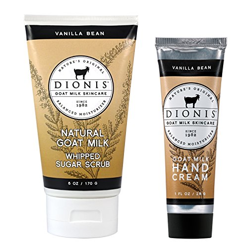 - Dionis Goat Milk skincare set that includes one 6-ounce Sugar Scrub and one 1-ounce hand cream in "Vanilla Bean" scent.