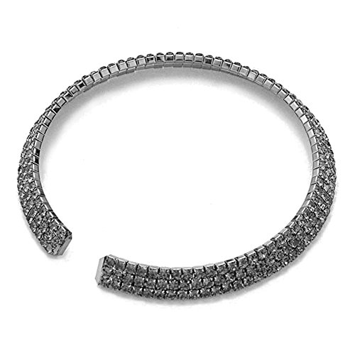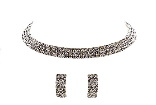 This is a simply designed, sparkling three row smoky color, faceted glass round-cut rhinestone choker necklace in a hematite-finish setting with matching curved, demi-hoop earrings.The choker has a 4 ½ inch diameter and measures 7/16 inch wide (slightly under ½ inch).