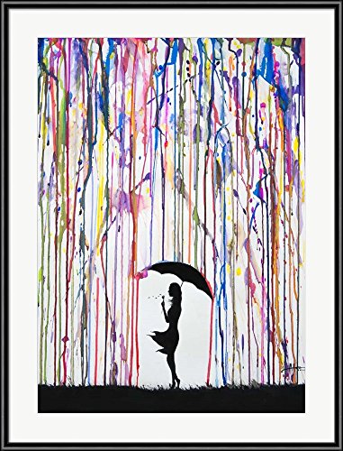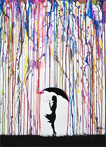 This poster features a modern art image of a girl standing under an umbrella covered in paint-splatter style rain, blowing on a dandelion seed flower, by artist Marc Allante.