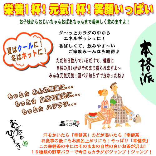 ◆保存方法 開封されました幸健茶は、密封をして冷暗所で風通しの良いところに保存して、なるべく早めにお飲み下さい。 |