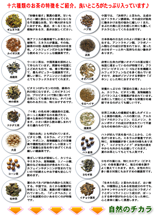 ◆ 健康茶の内容 ハブ茶・ギムネマ茶・ルイボス茶・オオバコ茶・モロヘイヤ・蓮葉茶・はと麦茶・ヨモギ茶・浜茶・イチョウ葉茶・杜仲茶・大豆・ドクダミ茶・柿の葉茶・烏龍茶・コーン茶 |