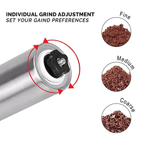 Easy to Use & Maintain: It is a simple and sleek design that will allow you to use it immediately without much instruction and a quick wipe after usage is all that is needed to keep it clean. The handle is easy to turn and grinds your coffee beans quickly and simply.