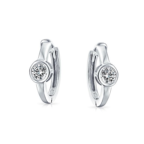 For a dash of sparkle with a demure, delicate design, choose these sophisticated sterling silver and cz, huggie hoop earrings. Accented by a singular, 4mm, brilliant, bezel set cz stud on a small hoop design. Lovely option for an April birthday.