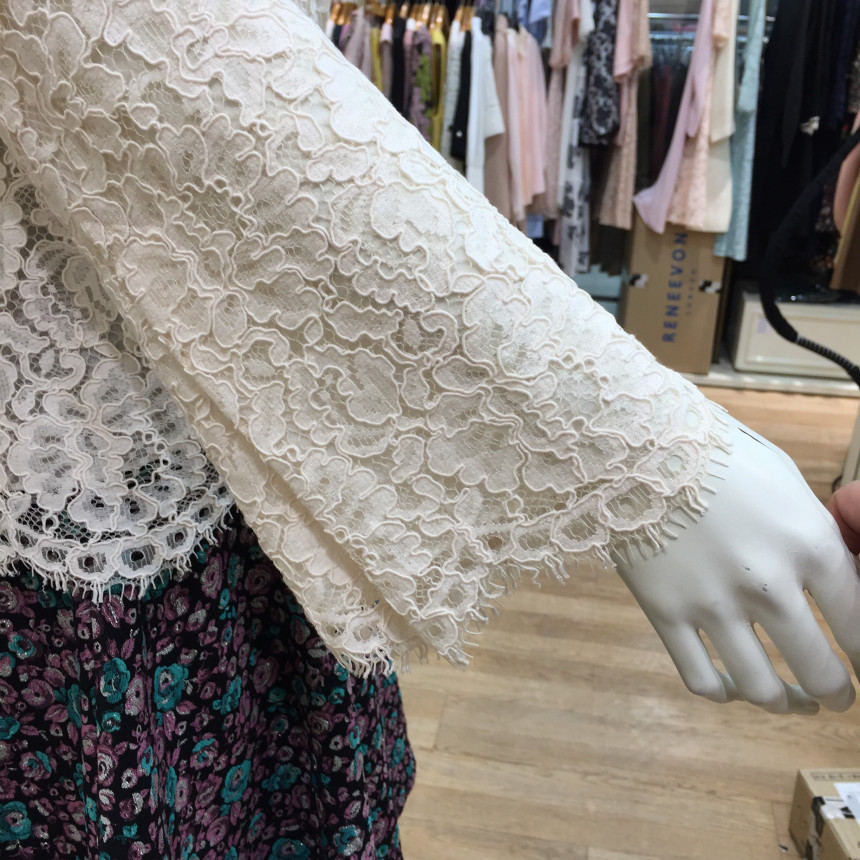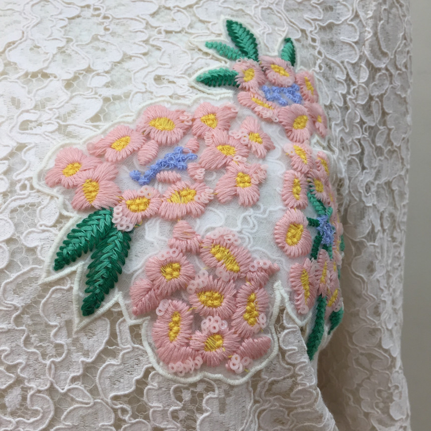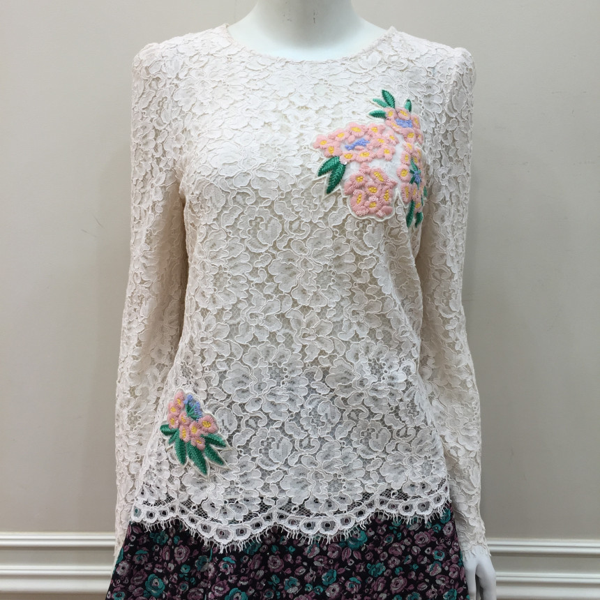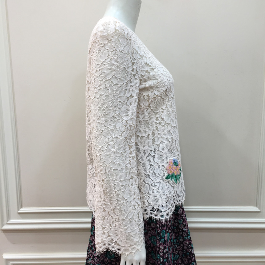 레이스원단에 칼라감이 사랑스러운 꽃모양의 자수를 놓은 블라우스 입니다.