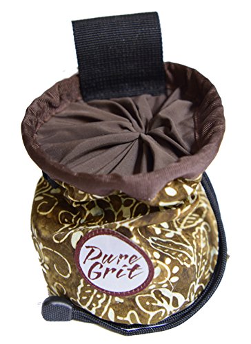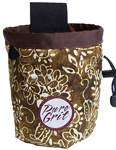 Product Description HAND-CRAFTED IN BOULDER, COLORADO. Pure Grit's brings a fresh and stylish option to chalk bags. Fashion driven with unique textured and printed fabrics inside and out, pick your favorite and bring some personality to the crag. Functional and high quality finish, it's a great addition to your climbing gear. Unique hand-dyed batik cotton fabric that are backed for durability and resist tearing. Smooth sliding synch cord lock closure that shuts 100% Dimensions: 5.5" tall x 4.0" diameter 48" adjustable and removable comfy 5/8" waist strap Fleece chalk compartment Gathered flower-design secure finish on bottom Elastic brush holder 0