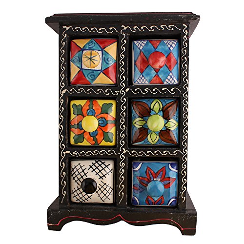 -. Feature : Material: Ceramic and Wood / Height: 9.75 Inches Width: 7 Inches and Depth: 4.25 Inches Approx / Handmade by Craftsman / 6 Drawers Spice Box / Free Shipping