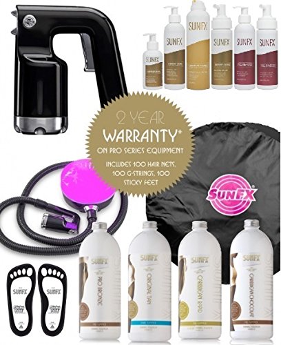 Our kit includes: SunFX Pro Mini Ambient Series and 2 award winning Spray Applicators, Durable Pop-Up tent and carry bag, 1 liter of our All natural/Organic Solution (enough for 25-30 applications), 3 125ml bottles of selected SunFX Solutions, 5 pairs of SunFX Sticky Feet Training DVD and Manual. Plus 2 Years Factory About the Product • SunFX has the reputation for having the world's best spray tanning systems, don't be fooled by cheap imitations. If it doesn't say SunFX it's not the best • SunFX has won multiple awards for its Systems and Solutions world wide • Proudly made/assembled in the USA • Each System including our Award winning Applicators are calibrated and tested prior to shipping to ensure quality control • Detailed Owner's Manual and Training DVD covering everything you need to know from applying the tan to maintaining your equipment. • In a time where our skin is exposed to an ever increasing number of harmful chemicals & artificial additives, we at SunFX have worked hard to ensure that our products remain the purest in the world. To achieve this we have created our solutions using the highest grade and most purest DHA available from the world's largest supplier (ECOCERTIFIED) They contain ONLY Natural & Organic Ingredients. On top of this, they are 100% Vegan, Not Tested On Animals, Alcohol, Paraben, Sulphate & Gluten Free. Mother Nature has provided us with the perfect ingredients, we have simply put them together to create the highest quality all natural solutions in the world. • To ensure the longest possible shelf life for you- Solutions are manufactured daily by SunFX in San Diego, CA. and Shipped FRESH! •SunFX also package as environmental sound as possible. • Ergonomically designed & lightweight in its construction & with a perfectly balanced trigger & handle. This allows for continuous applications without cramping or discomfortFeature