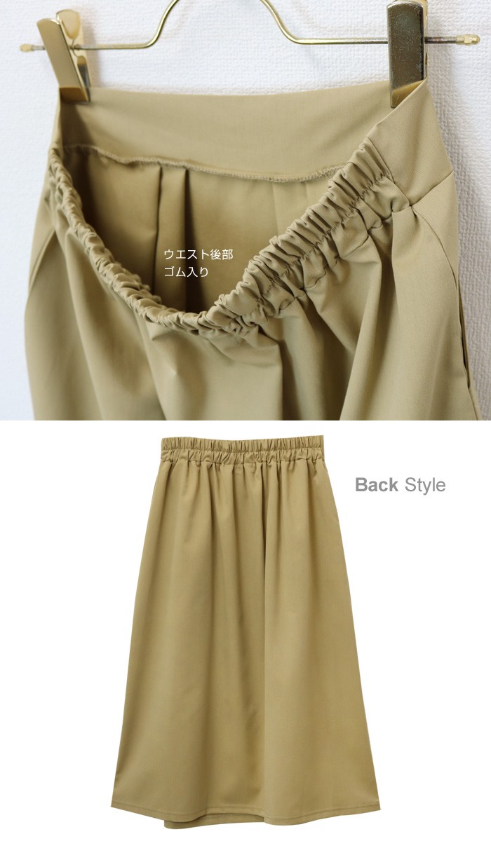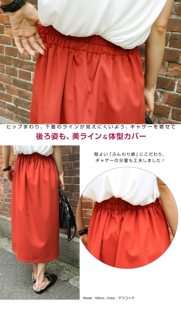 ふっくら過ぎず、タイト過ぎない。ベストなシルエットにこだわったミモレ丈・楽ちんゴム入りスカート。さらっとしたマットな質感の薄手ツイル生地を使用。フロントタック入りで美ラインに。便利なサイドポケット有、後ろウエストはたっぷりのゴムシャーリングでラクラクです♪後ろ部分もギャザー入りでヒップまわりの体型カバーも◎ヒールからスニーカーまで、大人女子の様々なシーンに対応してくれる1枚です。※裏地なし※透けにくい素材を使用していますが気になる方はインナー・ペチコートをご利用ください。MODEL:身長162cmMサイズ