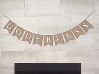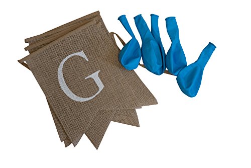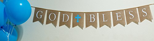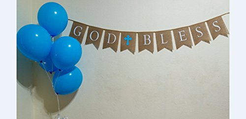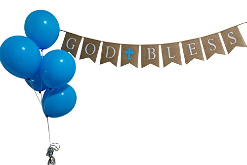 God Bless Burlap Boy Banner - Baptism - First Communion - Christening - Baby Shower - 5 Baby Blue Latex Balloons