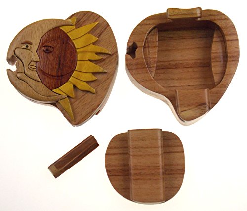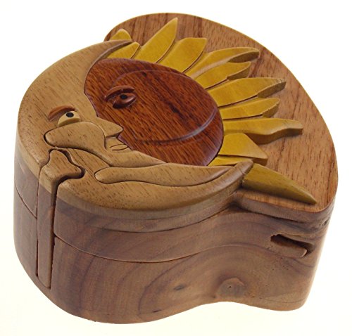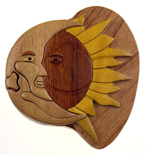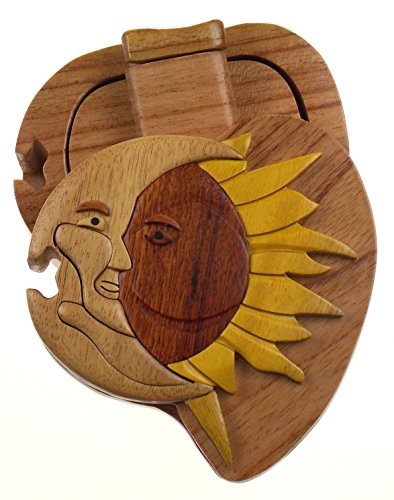 Studio : Hickoryville Publisher : Hickoryville Binding : Kitchen Product Description Handmade carved Sun Moon intarsia wood puzzle box bundled with Hickoryville instructions on opening and closing the puzzle box. This secret puzzle box is a beautifully handcrafted creation, high quality workmanship, made of natural wood. The box is a puzzle that comes apart into four pieces and discovers a secret space to keep special treasures. Inside storage space is approximately 2.7 inches long x 2 inches wide. Every box is a unique, handcrafted creation and yours may vary slightly from the photos. 0