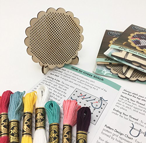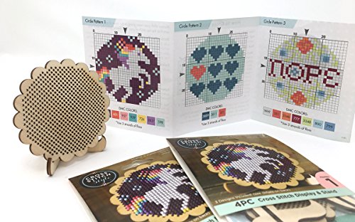 ADORABLE: The scalloped wood circles you cross stitch are super cute and just 3 inches; they are pre-punched and fit onto the included wood easels, making ideal desktop or shelf displays.