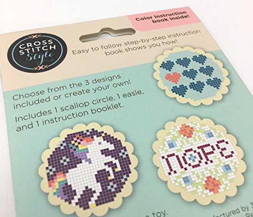 CONTENTS: This craft kit comes with three complete scalloped wood cross stitch displays and stands, three illustrated designs and instructions -- including a Unicorn, Hearts, and the word "Nope", a package of embroidery needles and 16 full skeins of DMC floss in each color for all three projects.