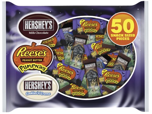 -. Feature : Pack of two, 50-piece bags of Hershey's assorted snack-size candy (50.1 total ounces) / Includes Hershey's Milk Chocolate, Hershey's Cookies N' Crème, and Reese's Peanut Butter Pumpkins / Chocolate bars feature tombstone wrappers / Pumpkin-shaped Reese's are made just for Halloween / Perfect for Halloween parties and trick-or-treating