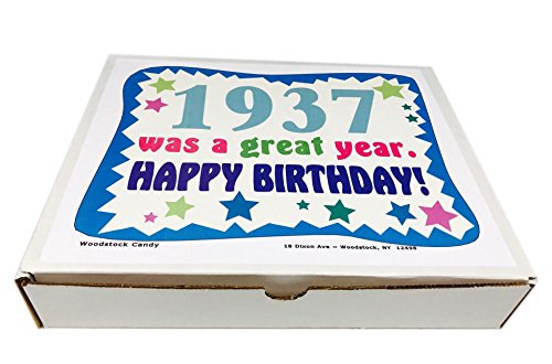 -. Binding : Misc. -. Brand : Woodstock Candy -. Feature : Contains 40 kinds of candy an 80 year old will remember from their youth / Box reads "1937 was a great year. Happy Birthday!" / Makes a great gift for someone who has everything / A great conversation piece of days gone by / Comes shrink wrapped in a box that measures 11.75" x 9" x 2" -. IsAdultProduct : 0 -. Label : Woodstock Candy -. Manufacturer : Woodstock Candy -. PackageQuantity : 1 -. ProductGroup : Grocery -. ProductTypeName : GROCERY -. Publisher : Woodstock Candy -. Studio : Woodstock Candy -. Title : 1937 80th Birthday Gift Box of Nostalgic Candy from Childhood for Men and Women