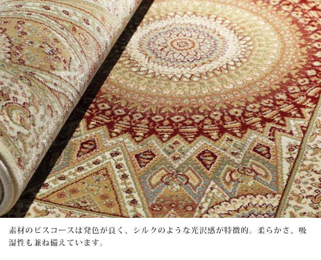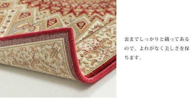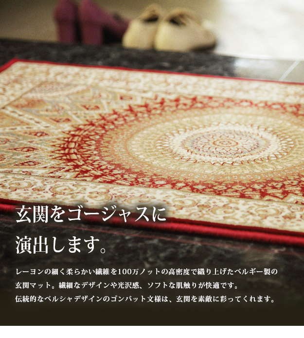 ※メーカー直送のため代金引換はお受けできません。※沖縄・一部離島は別途送料がかかります。お見積もりいたしますのでお問い合わせ下さい。商品について:レーヨンの細く柔らかい繊維を100万ノットの高密度で織り上げたベルギー製の玄関マット。繊細なデザインや光沢感、ソフトな肌触りが快適です。伝統的なベルシャデザインのゴンバット文様は、玄関をゴージャスな雰囲気に演出してくれます。サイズ(cm):幅60x奥行90cm・約2.2kgカラー:アイボリー・レッド材質:レーヨン100%株式会社ナカムラ(51000063)