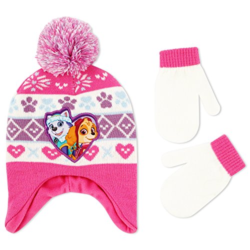Nickelodeon Toddler Girls Paw Patrol Skye and Everest Acrylic Hosiery Knit Contoured Short Winter Hat with Pom and Matching Mitten Set