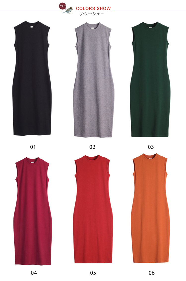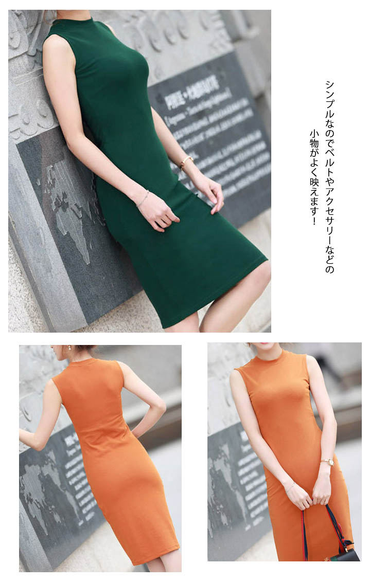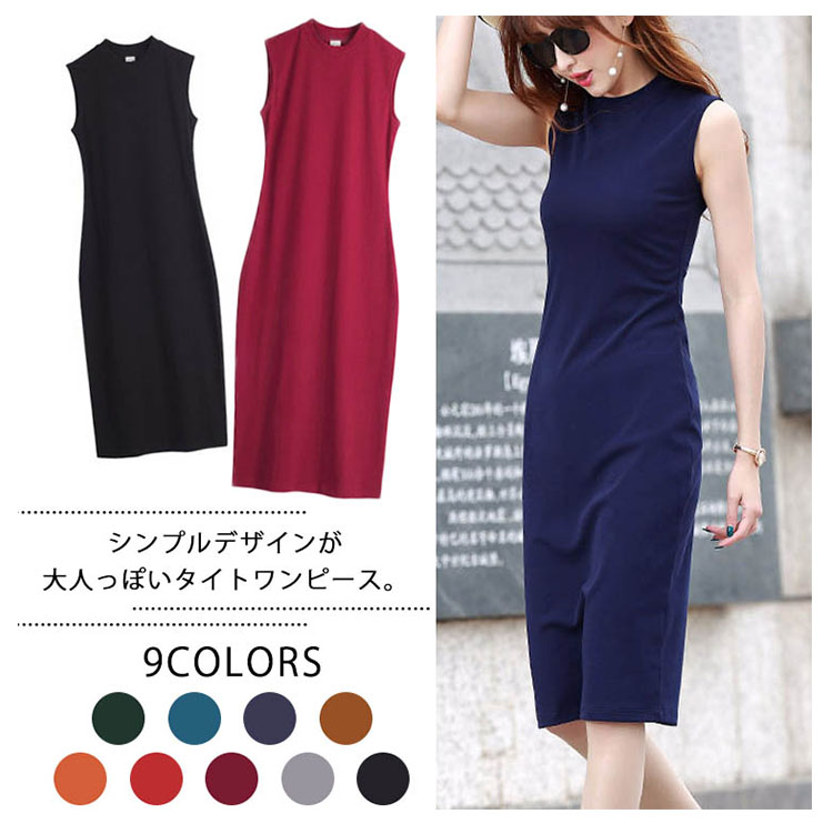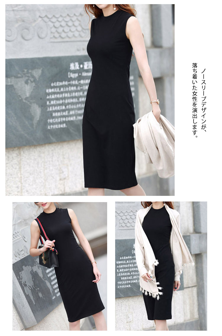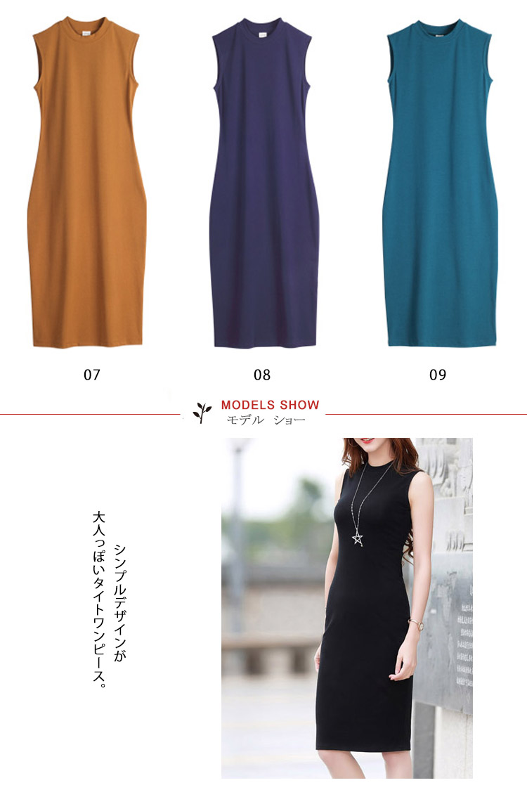 | シンプルデザインが大人っぽいタイトワンピース。ノースリーブデザインが、落ち着いた女性を演出します。しっかりとした伸びのよい生地で、タイトシルエットでも着心地抜群です♪シンプルなのでベルトやアクセサリーなどの小物がよく映えます! | |