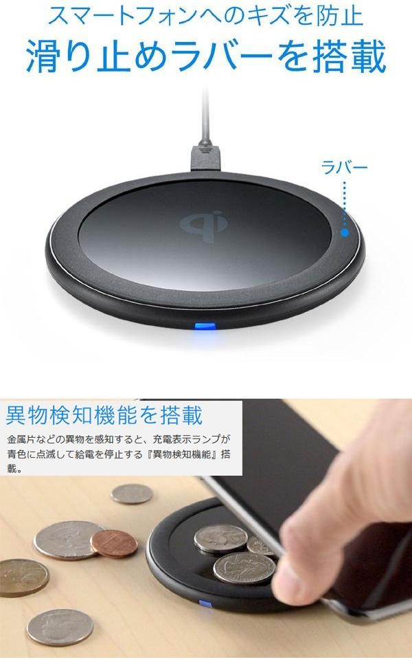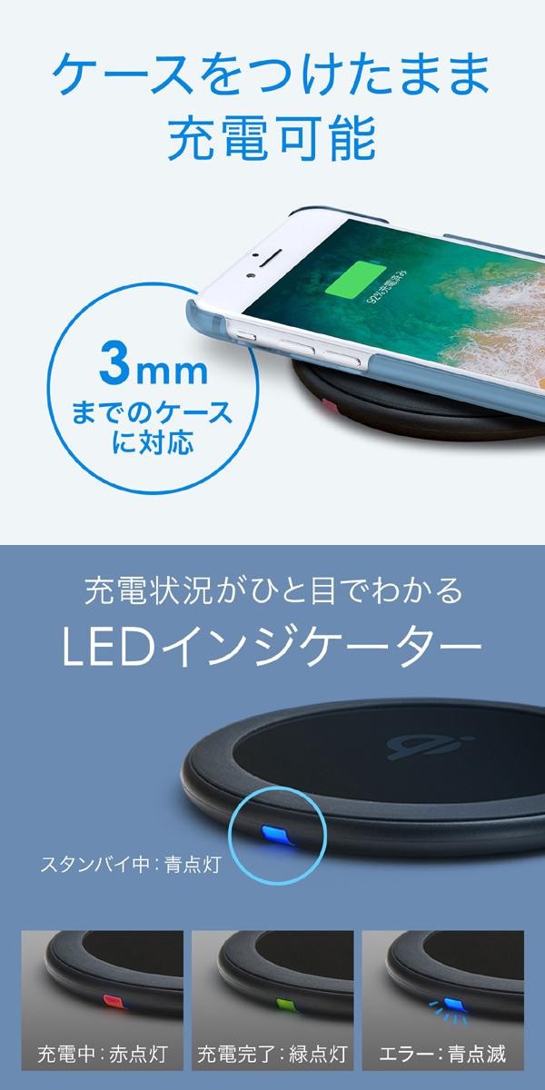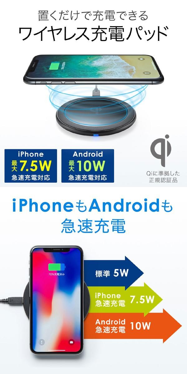 ワイヤレス充電の規格「Qi(チー)」に準拠し、最大10Wまでの出力に対応した正規認証品のワイヤレス充電パッドです。Qi(チー)規格に準拠したスマートフォン等をおくだけで充電することができるので、充電ケーブルに接続する必要がありません。薄型で場所を取らないコンパクトデザインです! |