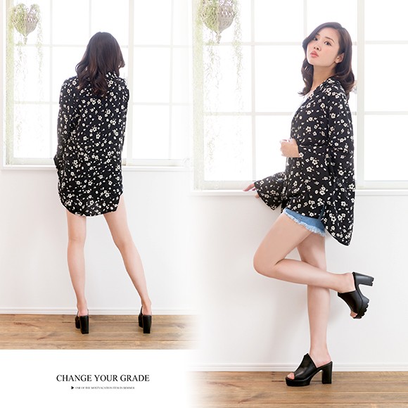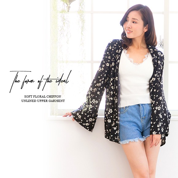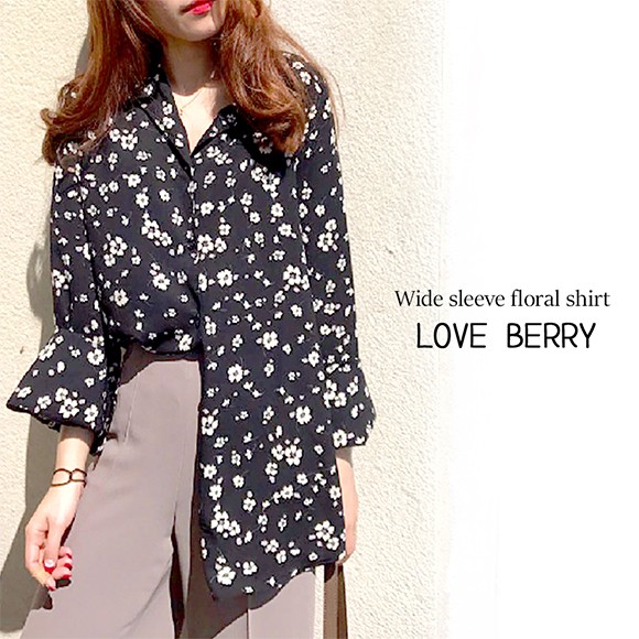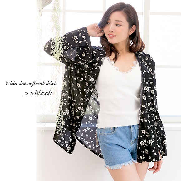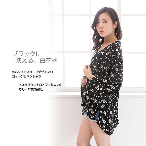 ブラックに白花柄が映えた、ちょっぴりレトロ×フェミニンな雰囲気のオシャレシャツです♪