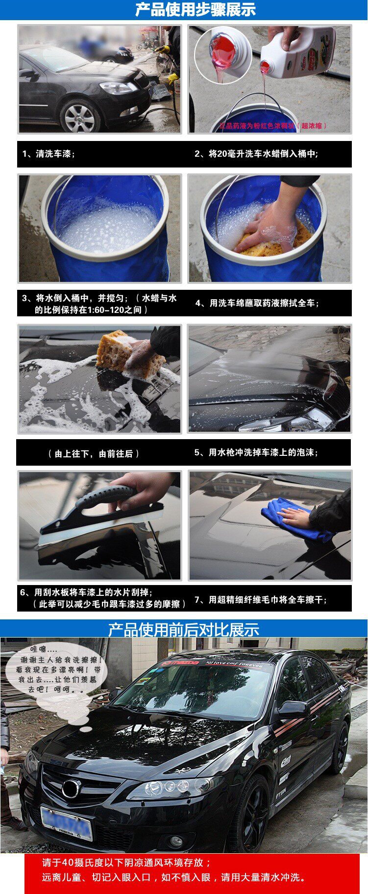 (2)按1:60—120的比例用水将药液稀释后,用洗车熊掌、海绵或毛巾蘸着稀释后的本品从上往下、从前往后均匀擦拭车体;