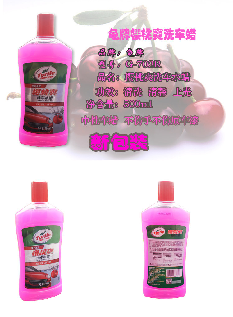 ?龟牌樱桃爽洗车香波用于日常汽车外部清洗,泡沫浓、细、密;高效活性清洁离子能迅速有效去除车身污垢及油膜,不留水斑;含有的润滑剂成分能有效减少擦车时带来的磨损;含有上光保护剂,清洁不脱蜡,漆面更加清澈、透亮,光滑,能有效抵御自然因素的干扰;经典的樱桃香型,是龟牌经历数十年证实,洗车时最清新的感觉。