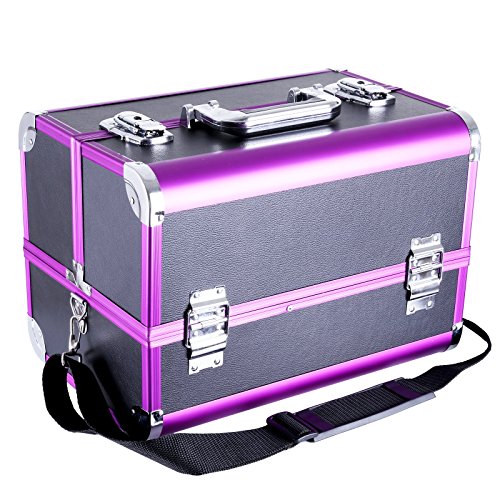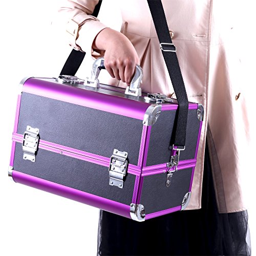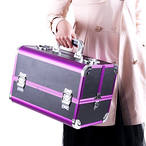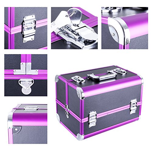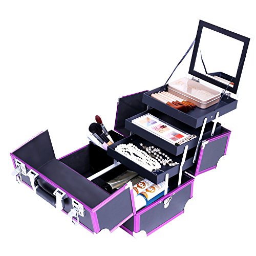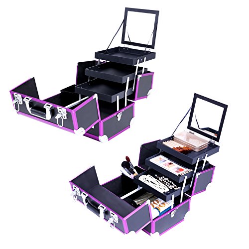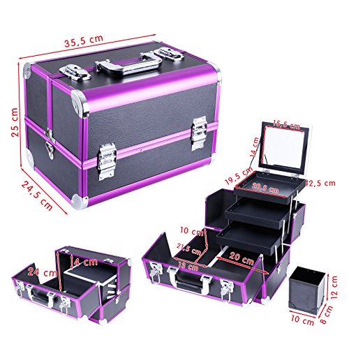 -. Feature : Gute Verarbeitung - Rahmen aus MDF-Platte und Oberfläche ist Kunstleder mit Aluleisten in Lila. Der Koffer ist robust und stabil. Mit einem ergonomisch geformten ABS Handgriff - komfortabel / Geniale Aufteilung - Insgesamt 3 aufklapbare Fächer, unten 1 großes Fach. Mit der herausnehmbaren Box können Ihre Make-up Pinsel und Stifte platzsparend verstaut werden Alles ist in Ordnung und griffbereit / Hohe Funktionalität - Deckel abschließbar mit 2 Klappschlössern. 2 Schlüssel dabei. Die Sicherheit Ihrer Schätze wird gewährleistet. Der Koffer ist mit Metallecken verstärkt, damit Ihre Schmuckstücke vor Staub und Kratzern geschützt werden / Elegantes Design - Klassische Verkleidung mit Litschi Maserung, schwarzes Kunstleder mit Aluleisten in Lila, Innenfutter aus EVA. Alles verleiht dem Kosmetikkoffer einen modernen und stilvollen Charme. Mit einem großen Spiegel (15,5 x 14 cm) / Leicht tragbar und pflegeleicht - Kann sowohl für die Aufbewahrung zu Hause benutzen, auch mit dem Tragegurte einfach auf Reisen mitnehmen. Dank des schwarzen Kunstleder lässt der Koffer sich einfach reinigen