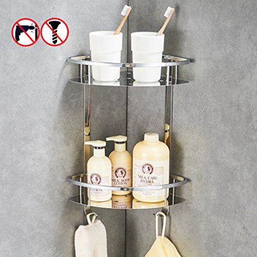 BESy Bathroom Corner Shelf Rack Floating Caddy - No Drilling, DIY, Super Strong Glue Adhering,Heavy Duty and Rustproof Stainless Steel 2 tiers Shower Storage Shelves Triangle Basket with Hooks,Chrome