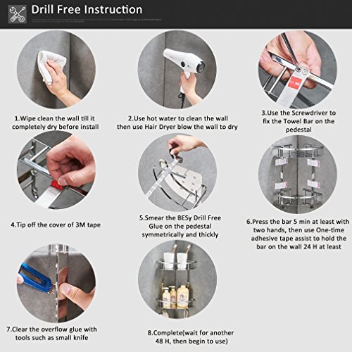 No Drilling:can be installed in any smooth surface as ceramic tiles.Self adhesive with the glue and the temporary one-time 3m tape. Please hold on 5 minutes at least and don't put anything on the shelf within 72 hours.