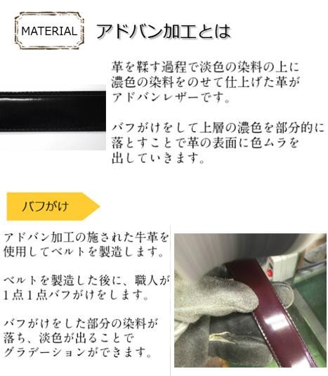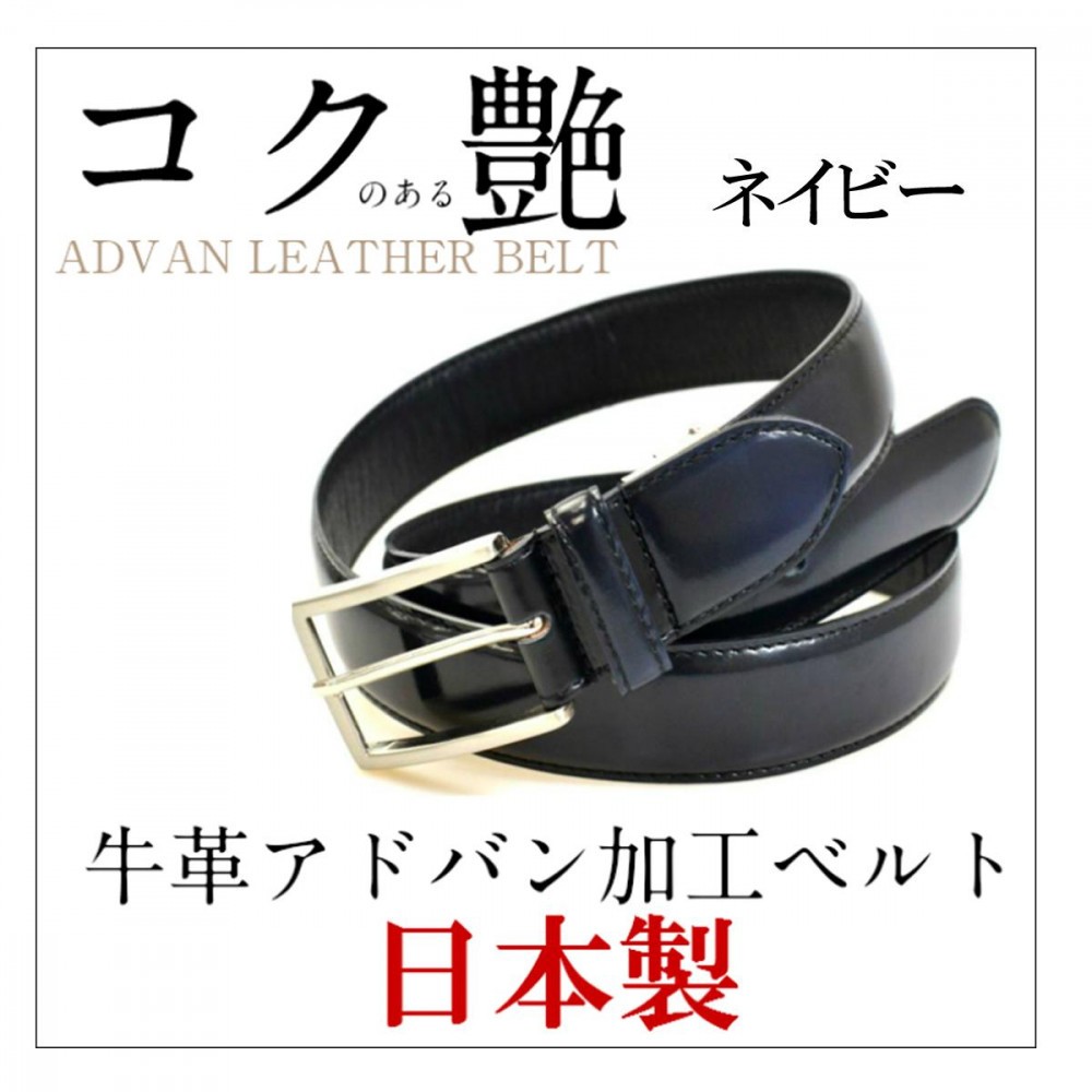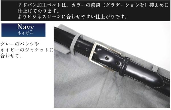 職人の手仕事による、艶のグラデーションが美しいビジネスベルトです。スーツ姿がワンランク上の仕上がりになります。深い色のネイビーです。 |