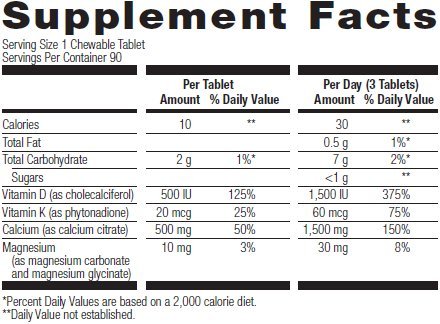 Studio : Bariatric Advantage Publisher : Bariatric Advantage Binding : Health and Beauty Product Description Now with increased vitamin D3 and improved taste! Chewable Calcium Citrate delivers 500 mg of calcium citrate along with 500 IU of vitamin D3 and vitamin K in a delicious chewable tablet formulated to be gentle on your digestive system and designed to support maximum calcium absorption. 0