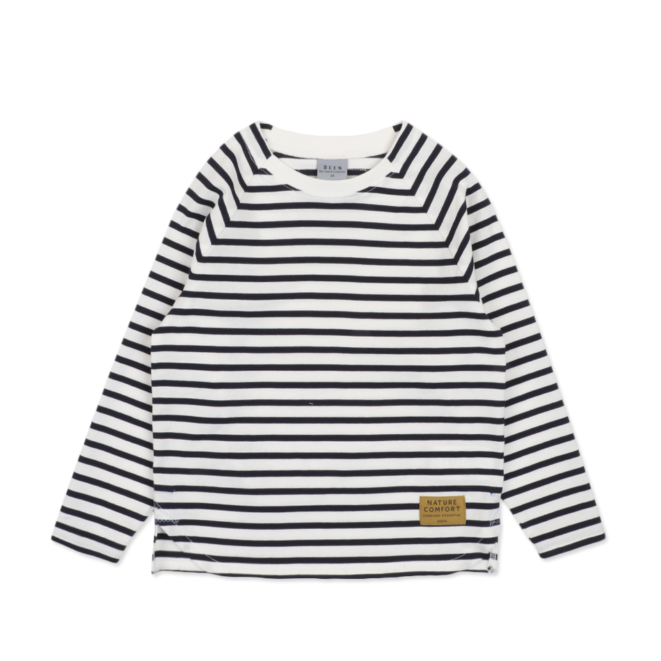 라운드 네크라인의 립배색과 주원단 디테일이 세련된 이미지를 연출해 주며, 스트라이프의 패턴이 변화하는 스포티함이 강조된 티셔츠 아이템입니다. 옆선 트임의 스카이 블루 지그재그 장식이 귀여운 포인트로 클린한 컬러감을 더해줍니다