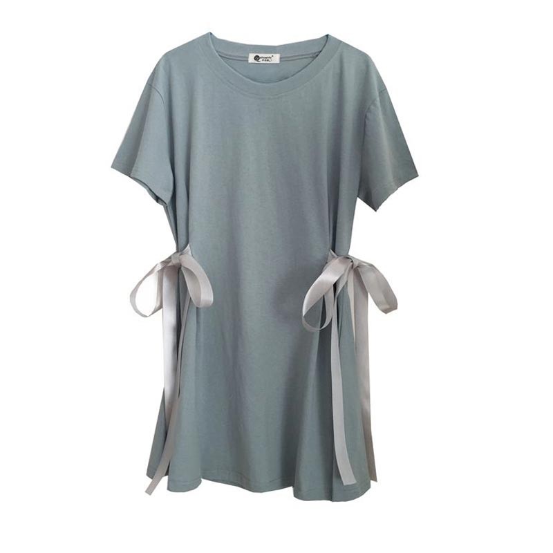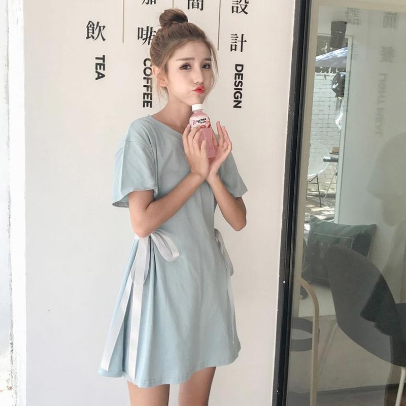 ラウンドネック・半袖のウエストサイドにリボンデザインのワンピース♪