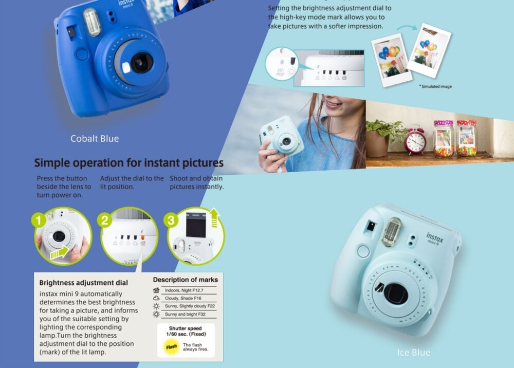 instax mini 9 automatically determines the best brightness for taking a picture, and informs you of the suitable setting by lighting the corresponding lamp.Turn the brightness adjustment dial to the position (mark) of the lit lamp.