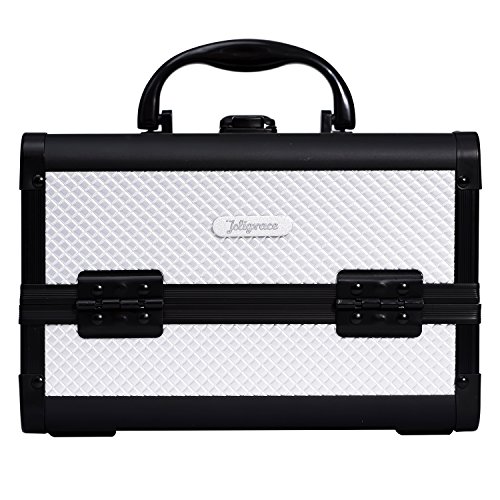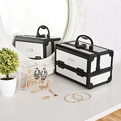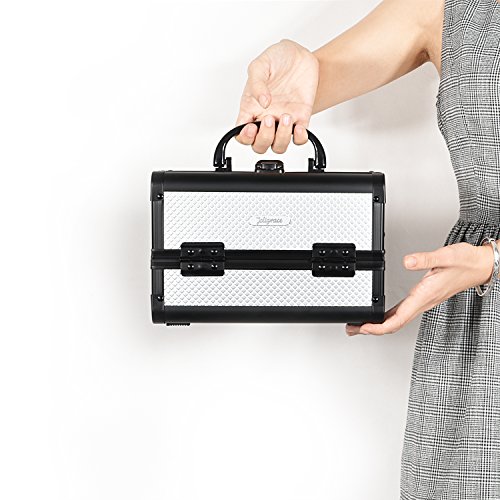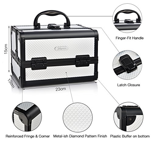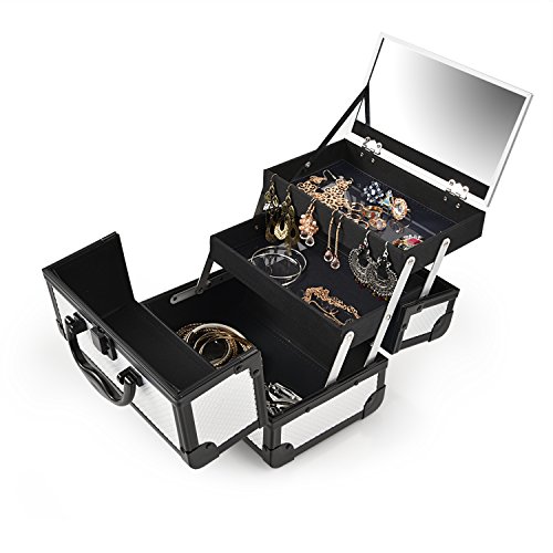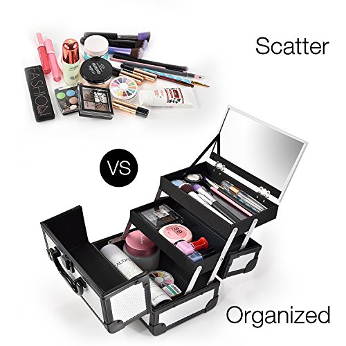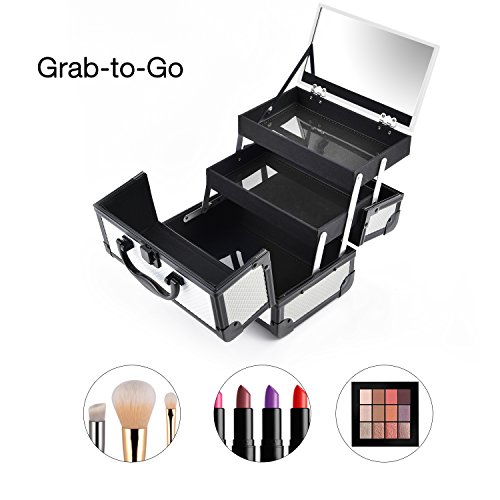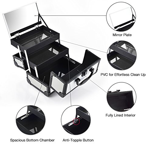Sturdy Construction Multiple Sections for Best Organization * Crafted of high quality aluminum frame with all black trimming for extra durability. * Heat resistant exterior made from high pressure laminates (the most durable decorative surface materials) keeps the case cool and protects your stash. * Wider opening with latch closure on top for easy access to tiers and base of case. * 2 fold out, extendable tiers with 1 large mirror lid on top and 1 main bottom compartment allow for ample storage of your makeup. * Internal water-proof fabric lining and PVC covers for easy caring. * Carry handle makes it easy to grab and go. * Plastic buffer on bottom for protection and standing up perfectly.