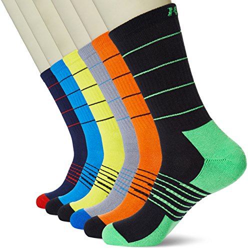 -. Binding : Apparel -. Brand : Kold Feet -. ClothingSize : Large -. Color : Multicolor -. Department : mens -. Feature : An Amazon brand / Six-pair pack of crew socks featuring supportive ribbing and striped leg / Wicking fiber helps transfer sweat and moisture away from feet to fight odor and keep you cool / Padded heel and toe helps provide superior resistance and outstanding durability / Cushioning under foot helps absorb shock and reduce impact / Y-shaped heel -. IsAdultProduct : 0 -. Model : FSP4A06L -. ProductGroup : Apparel -. ProductTypeName : SOCKSHOSIERY -. Size : Large -. Title : Kold Feet Sports Men's 6 Pairs Colorful Athetic Cushion Crew Hiking Socks Large Multicolor