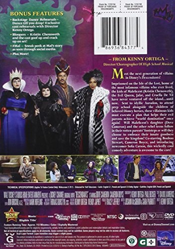 -. Feature : Descendants DVD Dove Cameron (Actor), Cameron Boyce (Actor), Kenny Ortega (Director) / Actors: Dove Cameron, Cameron Boyce, Booboo Stewart, Sofia Carson, Mitchell Hope Directors: Kenny Ortega Writers: Josann McGibbon, Sara Parriott / Format: Multiple Formats, AC-3, Color, Dolby, Dubbed, NTSC, Subtitled, Widescreen Language: English (Dolby Digital 5.1), French (Dolby Digital 2.0), Spanish (Dolby Digital 2.0) / Subtitles: French, Spanish, English Dubbed: French, Spanish Region: Region 1 (U.S. and Canada only. Read more about DVD formats.) Aspect Ratio: 1.78:1 / Aspect Ratio: 1.78:1 Number of discs: 1 Studio: Walt Disney Studios Home Entertainment DVD Release Date: July 31, 2015 Run Time: 112 minutes