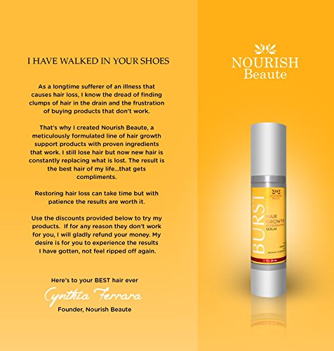 Stop excessive hair loss and grow hair faster with BURST. Natural, organic Pro-Botanic Complex with argan oil, biotin and more, is combined with 3% Redensyl® for the most technologically advanced growth stimulating product available. Two time winner of the Silver Medalist of Innovation Zone Best ingredient Award, Redensyl combines two patented molecules - DHQG and EGCG2 - to help hair loss and reactivate hair growth by targeting hair follicle stems cells, reactivating the proliferation of ORSc stem cells, protecting them from apoptosis, maintaining their differentiation properties and helping to activate the metabolism of dermal papillary fibroblasts. A clinical assessment on volunteers produced outstanding results. In less than 3 months, 85% of subjects showed visible positive results with 214% increased hair growth. That's 2X better results than Minoxidil, without the harmful chemicals. 0 |
