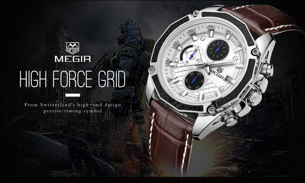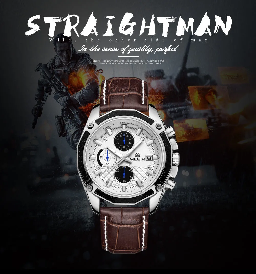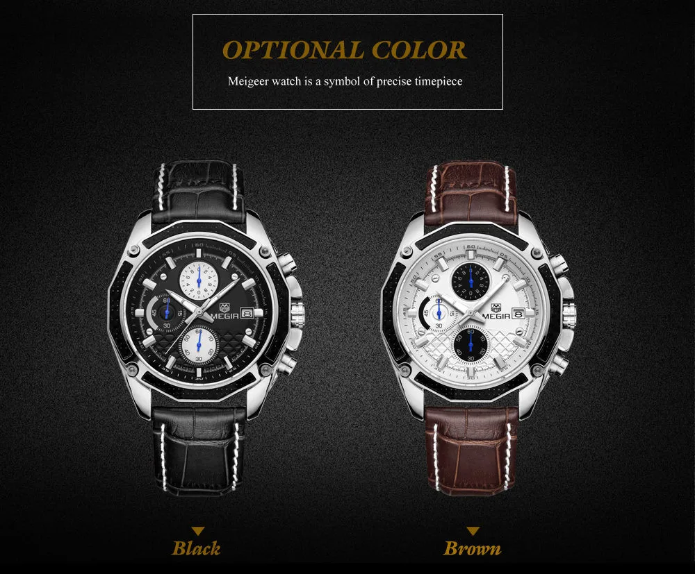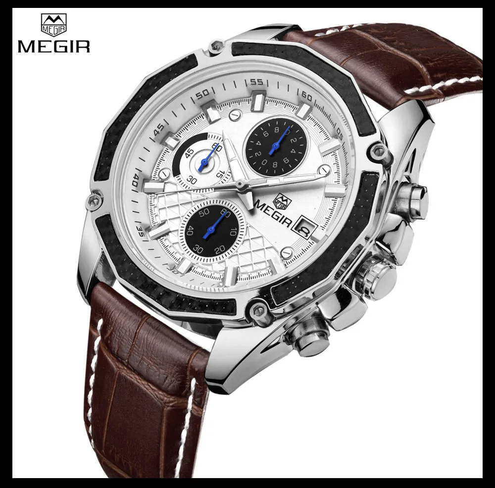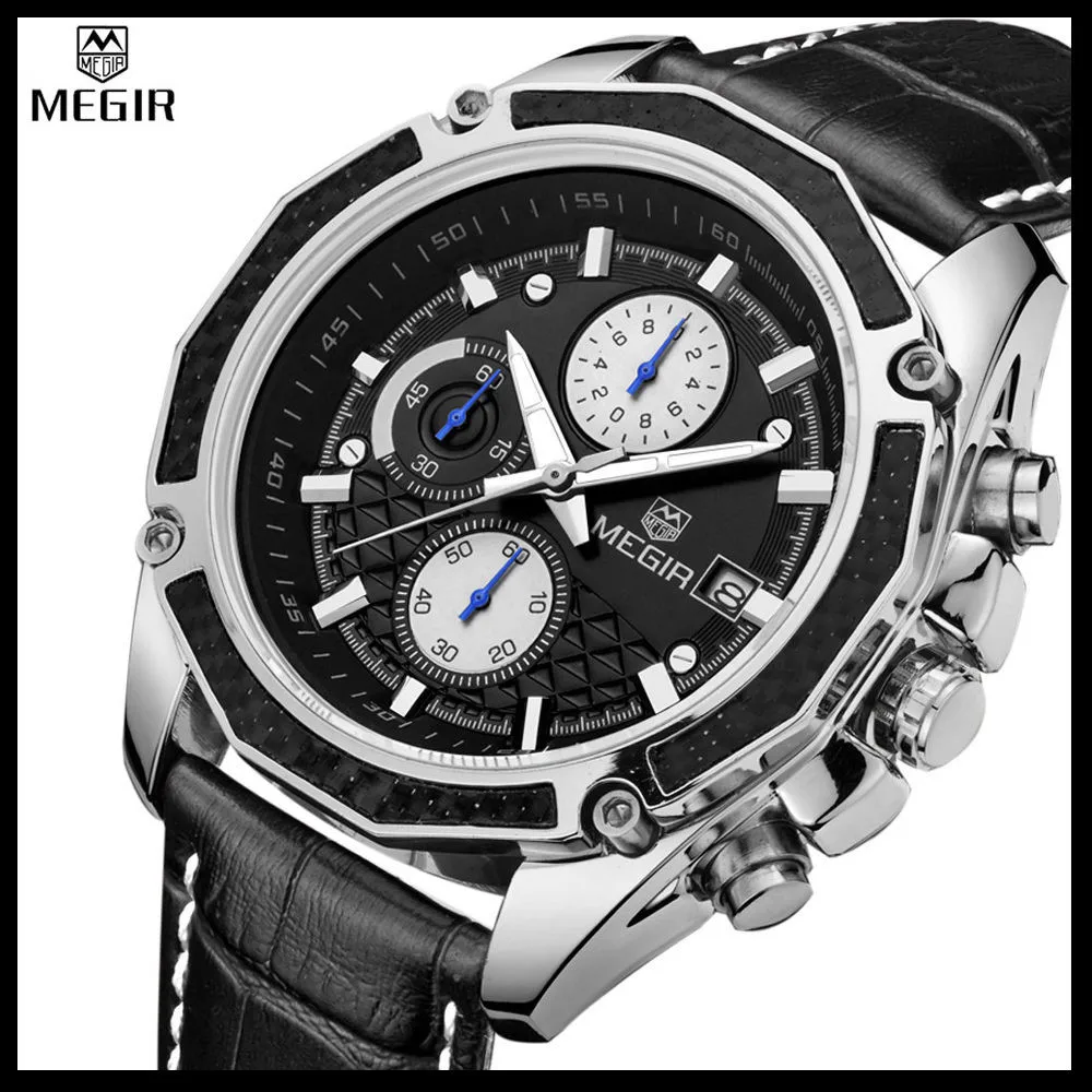 Genuine MEGIR quartz male watches Genuine Leather watches racing men Students game Run Chronograph Watch male glow hands