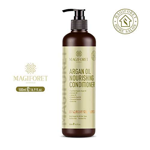 -. Feature : FEATURES: MagiForet Argan Oil Nourishing Conditioner detangles, smoothes, shines and corrects dry, frizzy hair. It is the best hair conditioner for undisciplined, dull hair damaged by coloring or seeking for more nourishment! In addition, it protects against heat and chemical damage. The featherweight formula with protective sunscreen helps repair and strengthen damaged hair. / NATURE INGREDIENTS: This professional hair conditioner restore the health of hair by infusing it with several natural organic botanical ingredients: antioxidant-rich argan oil, strand-strong Avocado Oil, moisture-locking Jojoba Oil, hair-revitalizing Camellia Seed Oil and moisture-attracting Botanical Keratin for optimal hydration for all hair types--from normal to dry hair, from curly to straight hair. / DAILY USAGE: This natural hair conditioner is a daily care formula designed to repair and restore weakened or damaged hair. It suits for dry, frizz, fine, split ends, color treated & chemically treated, damaged, breakage, heated hair. It is color-safe, sulfate-free, phosphate-free and paraben-free. / SMELL PLEASANT: Its smell makes you have the feeling of "Sexy Lady" and lasts for a long time. / 100% SATISFACTION GUARANTEED: Your satisfaction is very important. If you are not completely satisfied with your purchase feel free to return Argan Shampoo to us for a full and prompt refund