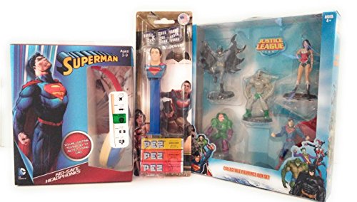 -. Feature : One Kids-Safe Superman Headphones Cushioned Ears and Volume Control / One Collectible Justice League Figurines Box Set: Batman, Superman, Wonder Woman, Lex Luthor, Doomsday / Superman Pez includes three candy packs: Orange, Strawberry, Grape / Great Gift for Collectors, Easter, Birthday Get Well, or any occasion or holiday