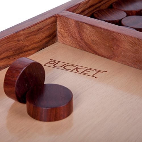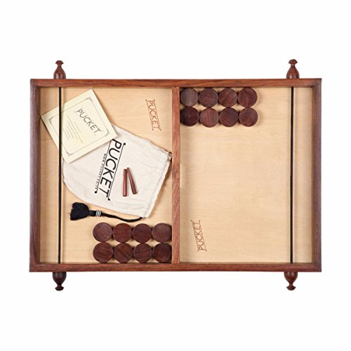 • CONTENTS: 1 Wooden board with a "gate" in the middle; 16 Wooden discs ("pucks"); 2 Tension pegs; 1 Cotton bag; Instructions