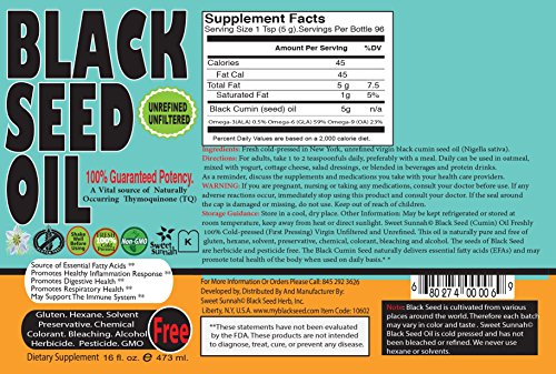 -. Binding : Health and Beauty -. Brand : Sweet Sunnah -. EAN : 0680569521453 -. Feature : Black Seed Oil Cold Pressed (First Pressing) 2x16 oz.- Non GMO Unrefined & Unfiltered,No Preservatives & Artificial Color - Glass Bottle - Product of USA / GLASS BOTTLE yes no plastic / Black Cumin Seed Oil by Sweet Sunnah is 100% Pure Nigella Sativa. Revitalizes Digestion, Enhances Immune Function, and is Loaded with Vitamins and Thymoquinone - / WHAT PHARMACEUTICAL MEDI GRADE MEANS? Each oil has differentmicar constituents. tr / Promotes total body wellness** A great natural source of omega-6 & 9 Has been used for hundreds of years in traditional health practices** -. IsAdultProduct : 0 -. Label : Sweet Sunnah -. LegalDisclaimer : The products and the claims made about specific products on or through this site have not been evaluated by the United States Food and Drug Administration and are not approved to diagnose, treat, cure or prevent disease. The information provided on this site is for informational purposes only and is not intended as a substitute for advice from your physician or other health care professional or any information contained on or in any product label or packaging. You should not use the information on this site for diagnosis or treatment of any health problem or for prescription of any medication or other treatment. You should consult with a health care professional before starting any diet, exercise or supplementation program, before taking any medication, or if you have or suspect you might have a health problem. -. Manufacturer : Sweet Sunnah -. MPN : ss -. PackageQuantity : 1 -. PartNumber : ss -. ProductGroup : Health and Beauty -. ProductTypeName : HEALTH_PERSONAL_CARE -. Publisher : Sweet Sunnah -. Size : 16.oz X2 -. Studio : Sweet Sunnah -. Title : Sweet Sunnah 2 Black Seed Oil Cold Pressed (First Pressing) 16 oz.- Non GMO Unrefined & Unfiltered,No Preservatives & Artificial Color - Product of USA -. UPC : 680569521453