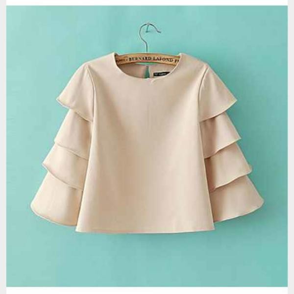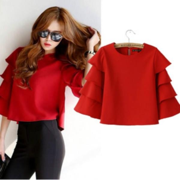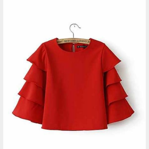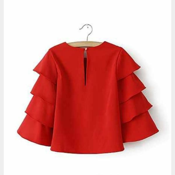 ボリュームティアード七分袖 カジュアルTシャツ ブラウス レッド