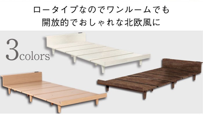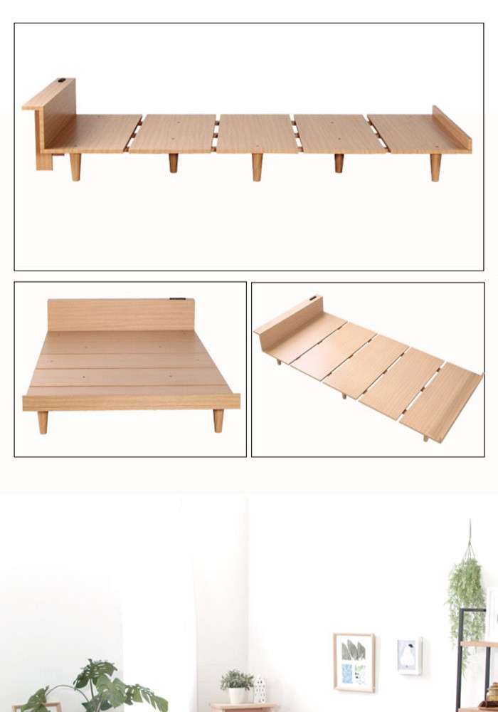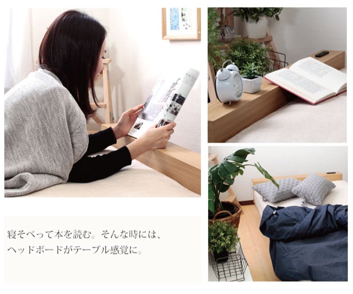 ●ヘッドボードにはスマホや雑貨が置ける棚スペースに、2口コンセント付で